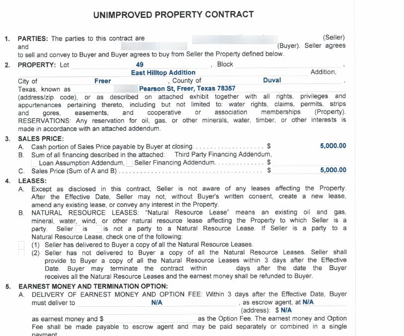 During that time we talked to the owner adjancent to the right most piece of our property. He had a shed that encroached on our property. We immediately struck a deal with him and sold him that portion of land for 5k cash. No title company involved to eat up closing costs, just a cashier’s check exchanged for a deed. Don’t have a closing statement to show but contract is below.