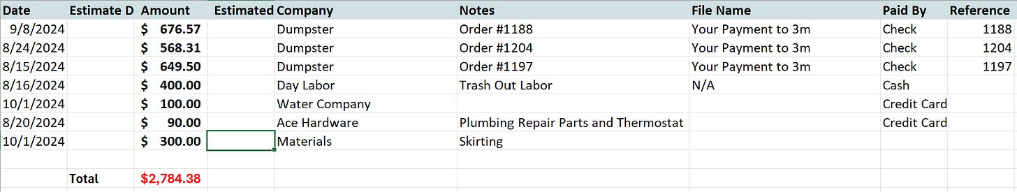 For this project, we filled up three 20 yard dumpsters to clean up the interior and some of the yard. We cut back the trees up on the roof, which were the cause of all the leaks. Cleaned up the back yard. A few plumbing leaks were fixed and that was it. Came in right at budget.