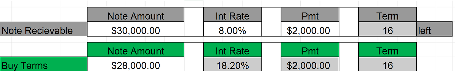 As you can see, I’m giving up about 2k of principal and 2k of interest on the full loan. I’m giving up $4,000 of profit for getting my money upfront. The investor buying the note at 28k is receiving a return of 18%+ on his capital. Not only that, the loan is secured against a property that’s worth 90k as of today to 200k once fixed up.