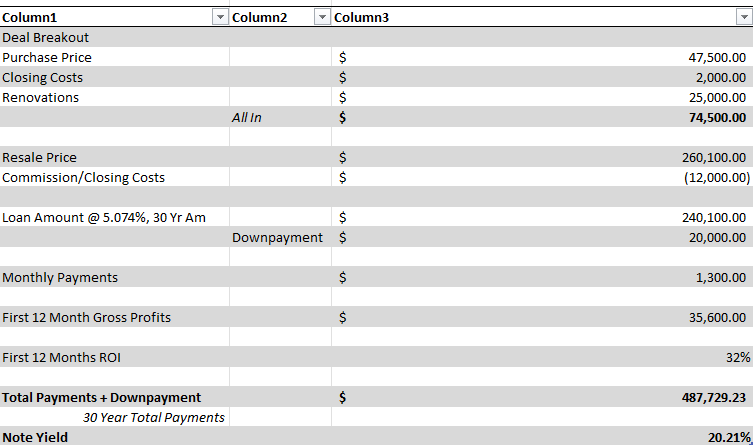 A couple things to note on this case study. This deal was a anomaly, the numbers shown are not typical of your average owner finance deal. I was able to purchase the underlying property at an extremely great discount. I seller financed this deal instead of flipping it.