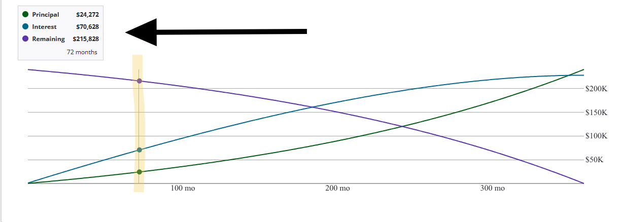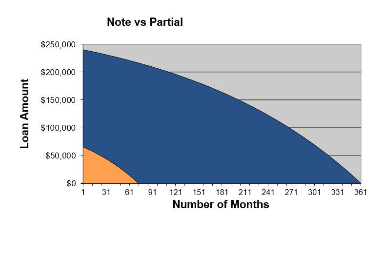 The orange (partial) is what I sold, the blue (original loan) is the remaining payments owed to me. Since I sold the front of the loan, when I receive my loan back to me after 6 years, a large part of the principal is still there. Specifically about $216,000. This is where the financial magic happens.
