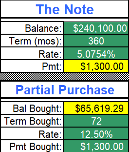 After 18 months of seasoning (owning a note while receiving payments), I listed this for sale. An investor reached out and was interested in making an offer for a partial. He wanted to make a 12.5% return on his money over 6 years. Since the note is at 5%, I would have to take a discount to make it work.